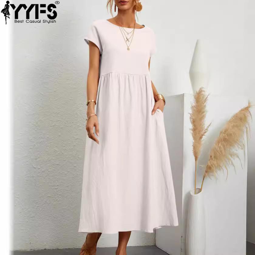 YYFS Женская мода лето весна однотонный принт с коротким рукавом и круглым вырезом свободная талия повседневные платья