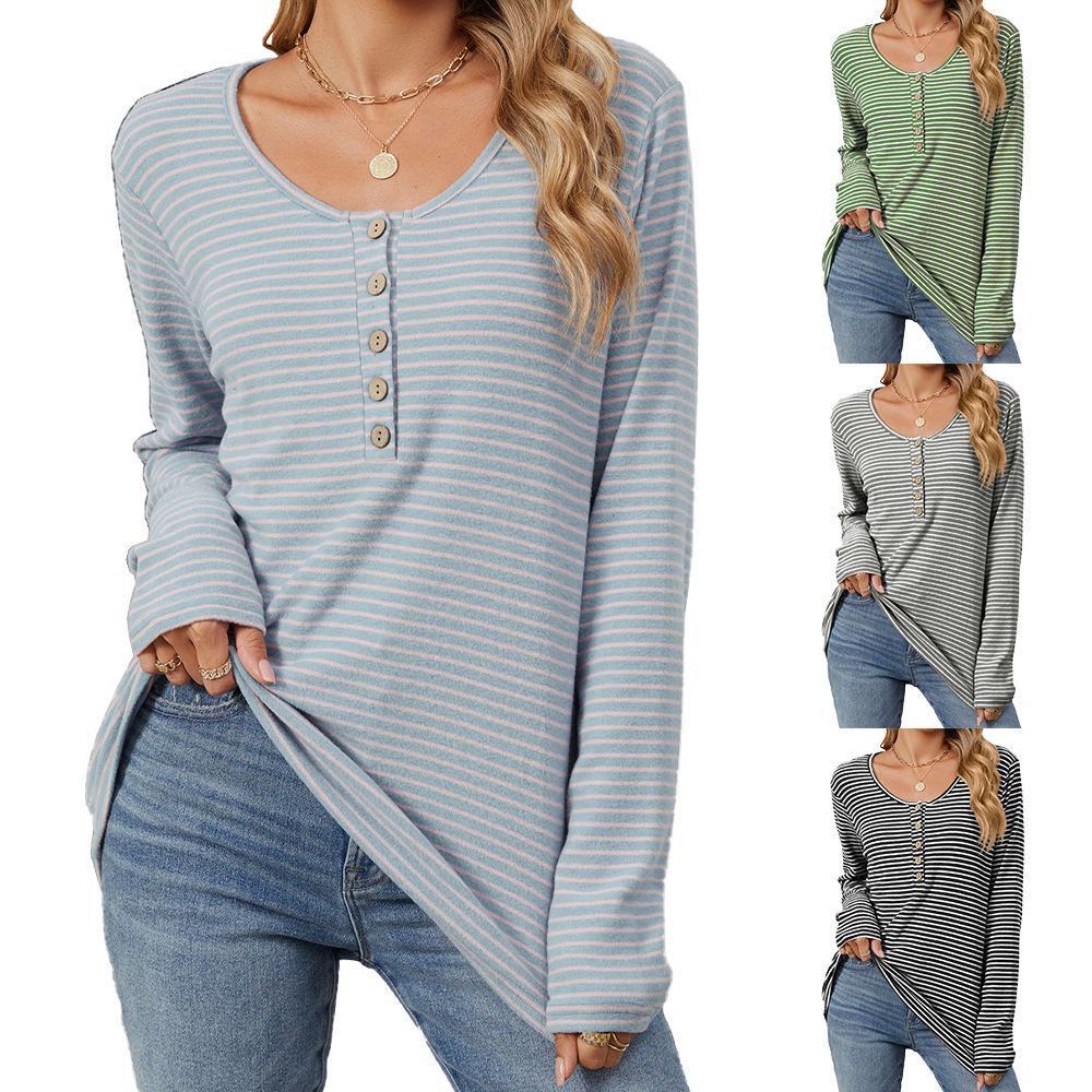 Осенне-зимний трикотаж Базовые рубашки с круглым вырезом на пуговицах Свободный крой Пуловер с длинными рукавами Полосатая футболка Повседневный топ для женщин