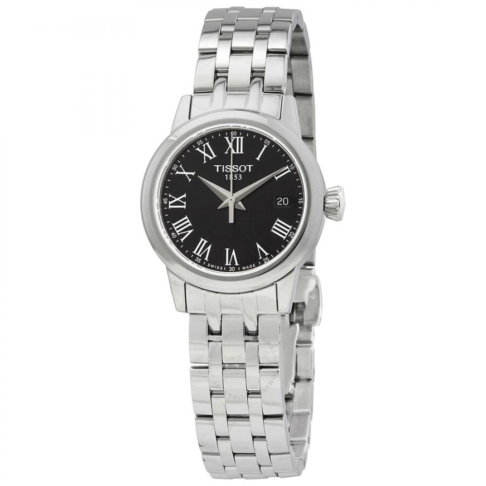 Часы Tissot Classic Dream Lady Quartz с черным циферблатом T129.210.11.053.00 имеют корпус и браслет из нержавеющей стали серебристого оттенка.. Он имеет фиксированный серебристый безель с черным циферблатом, на котором изображены серебристые стрелки и римские цифры часовых меток.. Кроме того, арабские цифры минутной шкалы расположены с пятиминутными интервалами, а аналоговый циферблат и указатель даты находятся в положении «3 часа».. Часы оснащены кварцевым механизмом и устойчивым к царапинам сапфировым стеклом.