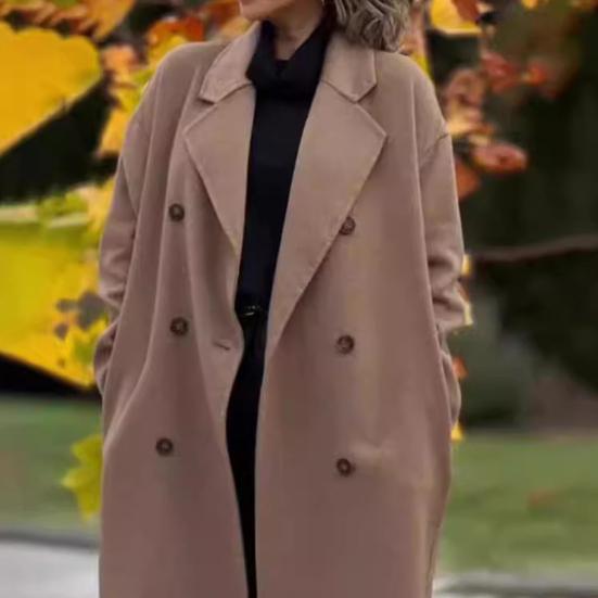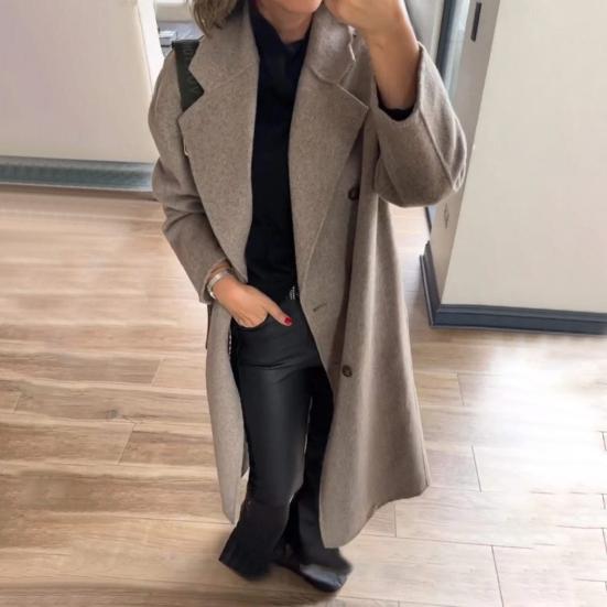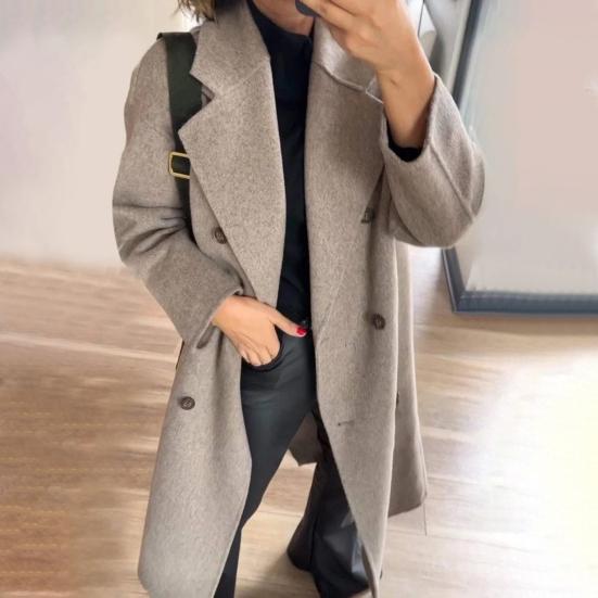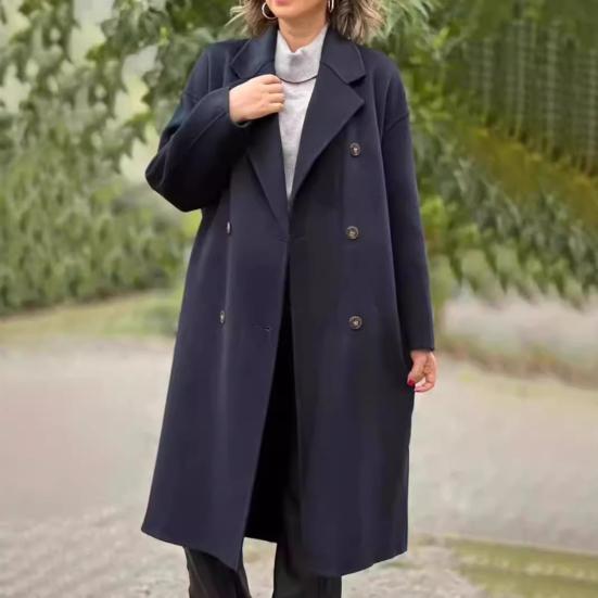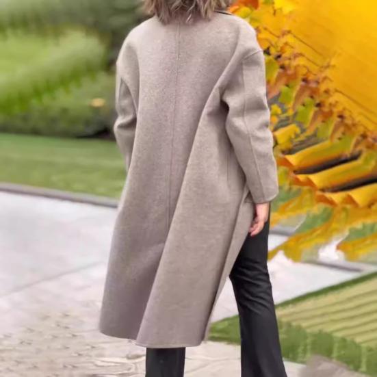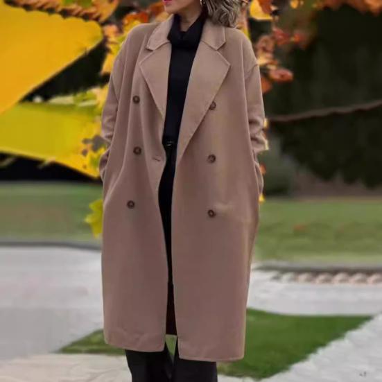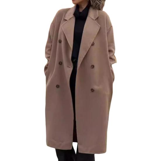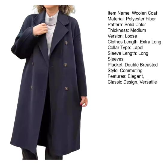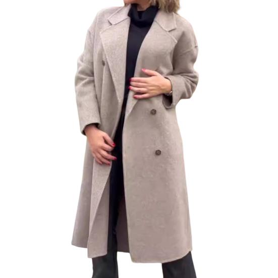 Элегантный и теплый: Это длинное женское пальто, выполненное из мягкой шерстяной ткани, излучает элегантность и очарование.. Двубортный дизайн лацканов добавляет нотку изысканности и идеально подходит для демонстрации вашего женственного стиля осенью и зимой.