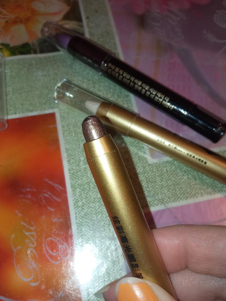 Тени красивы только на картинке, по факту полупрозрачные с коричневым оттенком и блестками,нет плотности при нанесении, на веках тяжеловаты,как мокрые,скатываются, из плюсов выдвижная система грифеля,длина которого где то 3 см, сам он быстро сломался и вываливается