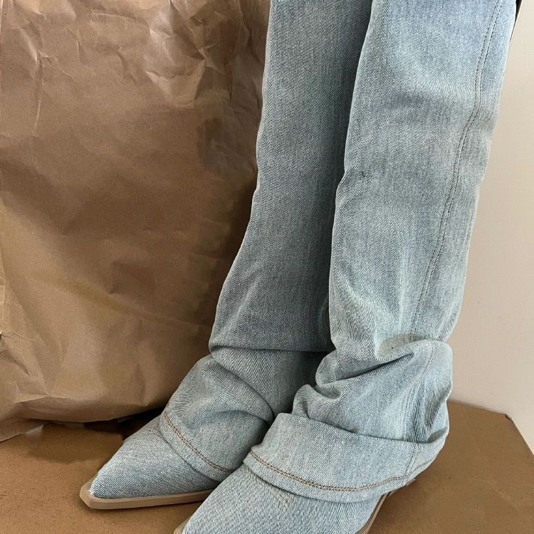 Женские плиссированные голубые ботфорты с заостренным носком на толстом каблуке, женские ковбойские сапоги в стиле вестерн, длинные сапоги