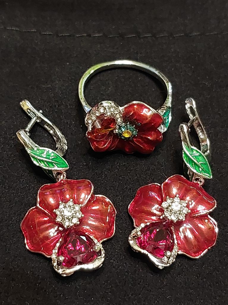 Это второй заказ.Серьги красивее, чем представлены на фото. Цвет тёмно- красный. Прозрачные лепестки, наклеенные на серебристый металл , дают эффект лёгкого свечения. Камешек на главном лепестке ещё более подчёркивает красоту цветка. Размер цветка больше, чем в аналогичном кольце. Смотрятся красиво.