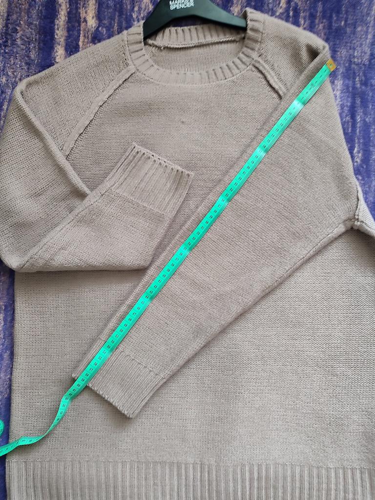 Размер М подошёл на параметры: ОГ - 105 см, ОТ - 96 см, ОБ - 100 см, рост - 164 см Цвет хаки - приятный спокойный (по ощущением в реальности цвет "кофе с молоком") Вязка - рыхлая лицевыми петлями, рукава реглан, швы хорошо обработаны Минус - на изделии отсутствуют какие-либо ярлыки)))) так что о составе пряжи трудно судить)