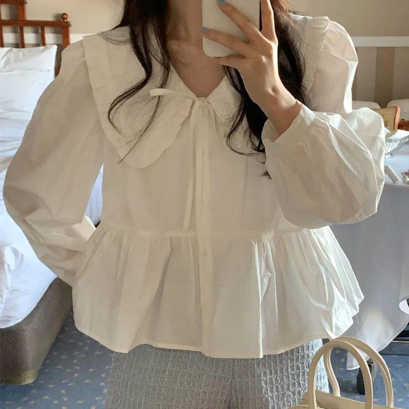 Harajuku Кукольный воротник Белая Милая Рубашка Женская Свободная Милая Шнуровка Французские Топы Женские Осенние Модные Длинные Рукава Однотонные Рубашки Для Женщин — купить товар онлайн с бесплатной доставкой по всему миру!