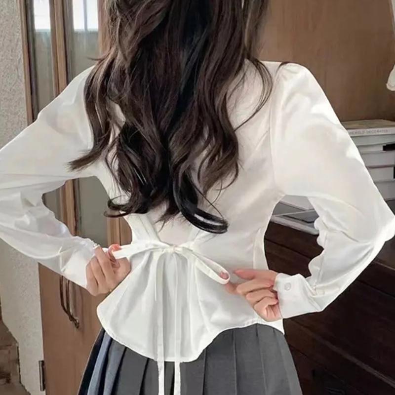 Милая рубашка в японском стиле для женщин, новая, с длинным рукавом, симпатичный дизайн, туника на шнуровке, блузка, осенняя мода, тонкая одежда на пуговицах