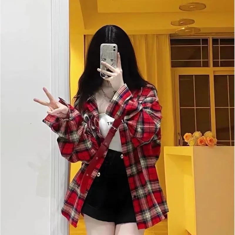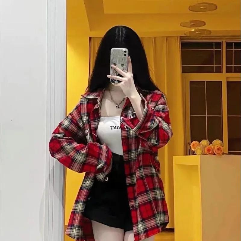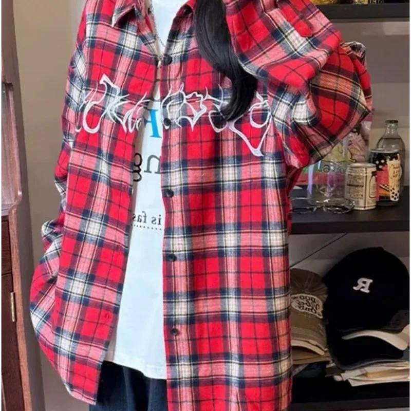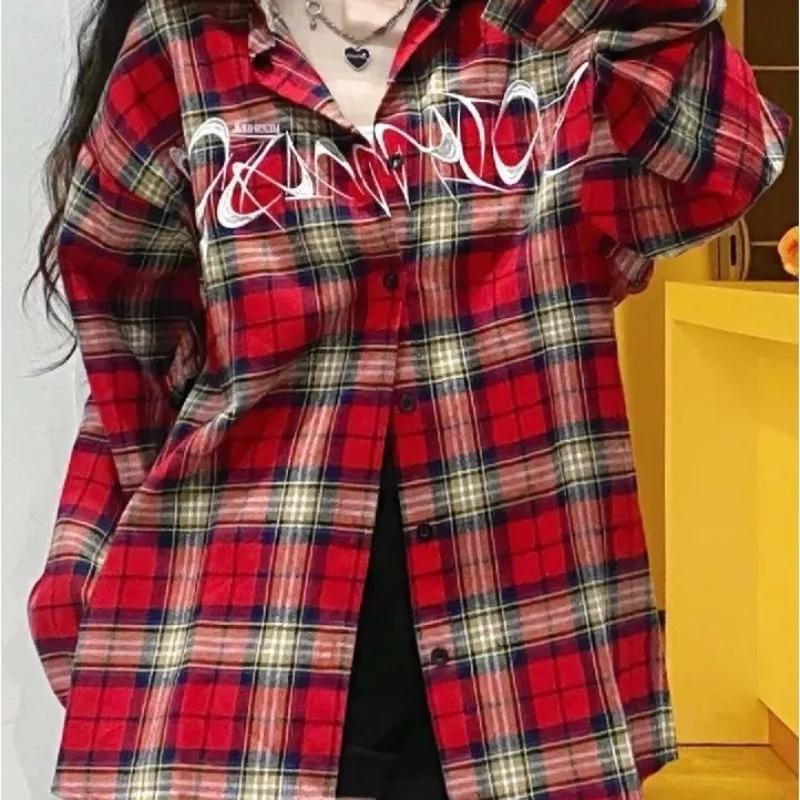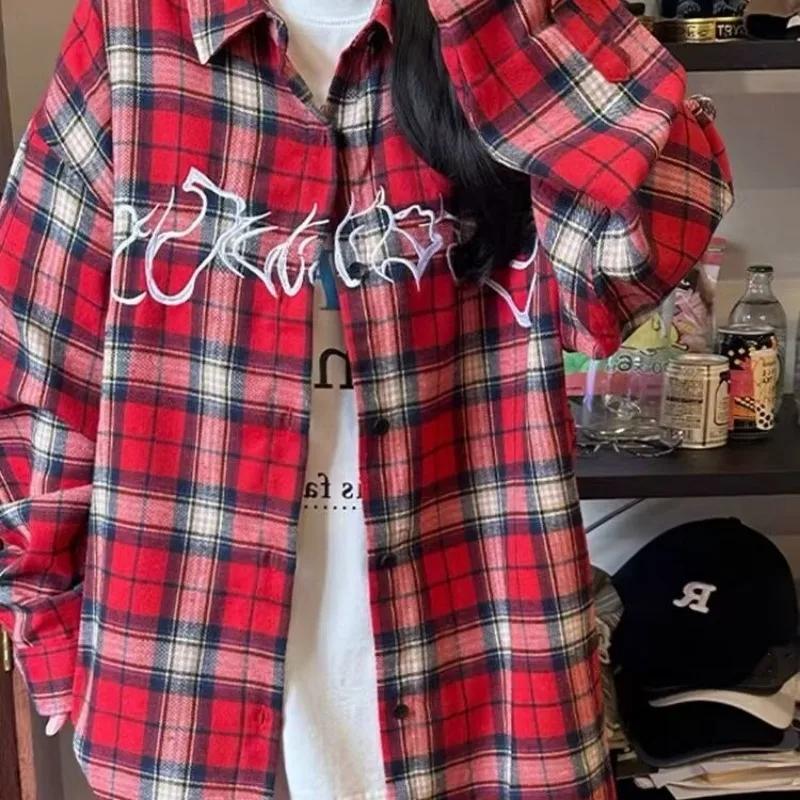 Красная клетчатая рубашка для девочек с вышитыми американскими буквами, свободные винтажные блузки с длинными рукавами, городские топы больших размеров