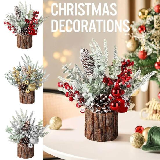 Настольная рождественская елка: Эти миниатюрные рождественские елки с реалистичными сосновыми иголками, ягодами, шишками и деревянной основой отличаются детальной отделкой и идеально подходят для декора как внутри, так и снаружи помещений.