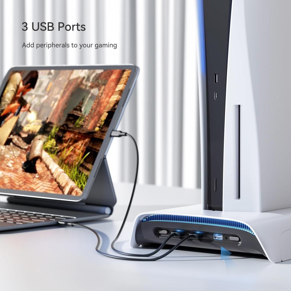 [3 USB-концентратора и 2 кнопки настройки] Три дополнительных порта USB2.0 позволяют подключать проводной контроллер, гарнитуру, мышь, планшет и т. д.. Имеются 2 кнопки для управления скоростью света и вентилятора соответственно, поэтому устройство может легко удовлетворить потребности в освещении и охлаждении, а также им легко пользоваться.. Он оснащен надежным болтом для крепления PS5 к охлаждающей станции, когда PS5 установлена на месте, что делает его хорошим аналогом официальной подставки, совместимой с PS5.