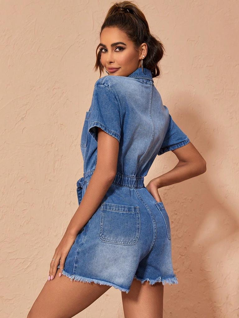 Стильный дизайн: Этот комбинезон с повседневным рваным дизайном, застежкой на пуговицы спереди и поясом на талии идеально подходит для модного непринужденного образа.
