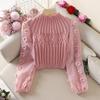 Женские свитера с высоким воротником, джемперы с рукавами-пузырями, сетчатые узкие короткие трикотажные топы с милыми цветами, шифоновая рубашка