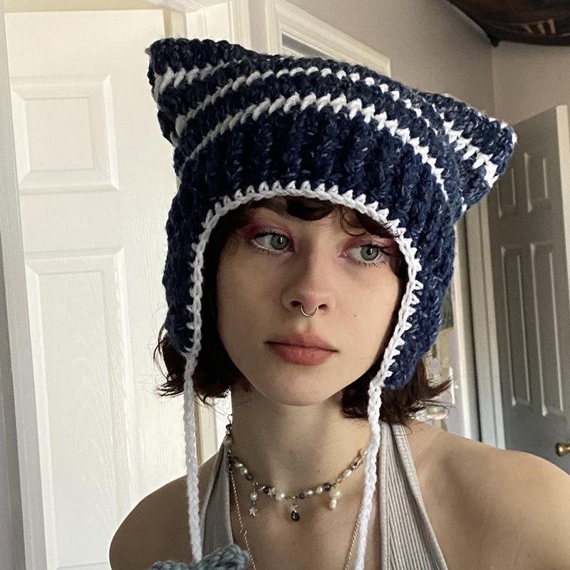 Женская вязаная шапка с лисьими ушками и полосатой шерстяной шапкой — купить товар онлайн с бесплатной доставкой по всему миру!