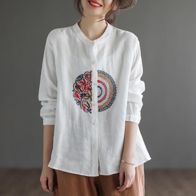 Весенняя рубашка свободного покроя с длинными рукавами в этническом стиле из хлопка и льна с вышивкой для женщин