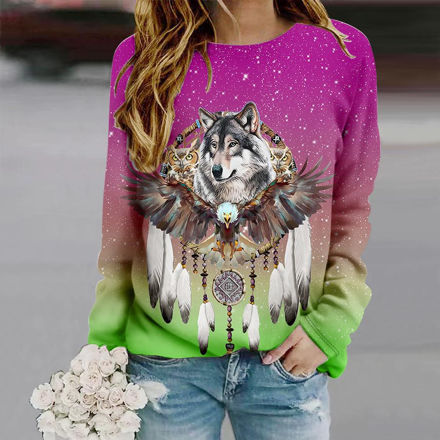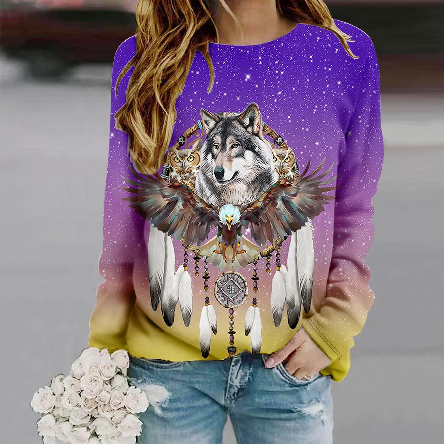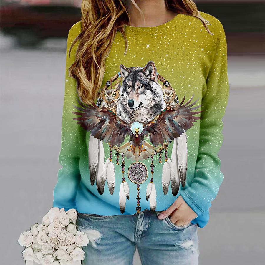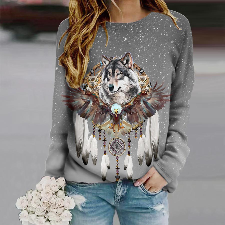 Топы для женщин с принтом волка и орла, круглый вырез, длинный рукав, футболка, осенний повседневный тонкий пуловер, женский топ с длинным рукавом
