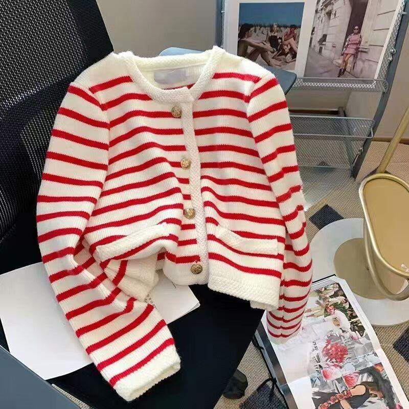 Полосатый круглый вырез вязаный кардиган для женщин осенняя свободная верхняя одежда женский короткий свитер пальто зимние элегантные облегающие винтажные кардиганы куртки 24916