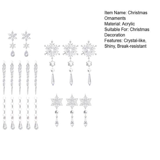 Украсьте свой рождественский интерьер этими изысканными рождественскими украшениями.. Эти подвесные украшения, имитирующие ножи для колки льда, изготовлены из высококачественного акрила и долговечны, безопасны и пригодны для повторного использования.. Их классический дизайн отличается высокой прозрачностью, что гарантирует, что они не выцветут и не сломаются, что делает их идеальными для следующего Рождества.. Эти прозрачные украшения, выполненные в форме очаровательных снежинок и сосулек, напоминают настоящие кристаллы, прекрасно улавливая и отражая свет под вашей рождественской елкой.. В набор входят 18 украшений в 5 стилях, каждое из которых компактное и легкое, идеально подходящее для элегантного украшения вашей елки.