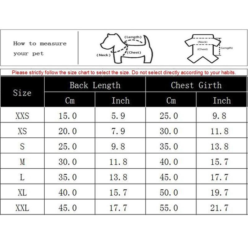 XS: Бюст:30 см/11,81 дюйма, длина спинки:20 см/7,87 дюймаРекомендуемый вес домашних животных:1-1.5кг(2,2-3,3 фунта).