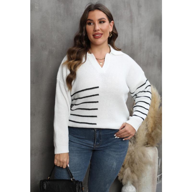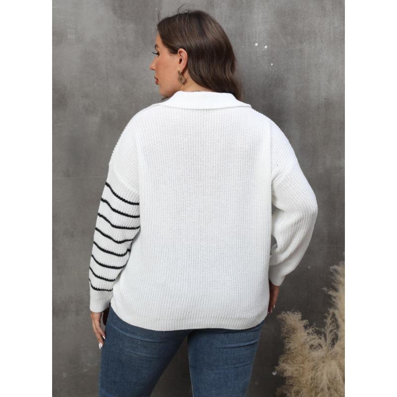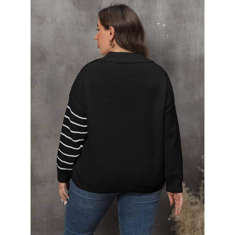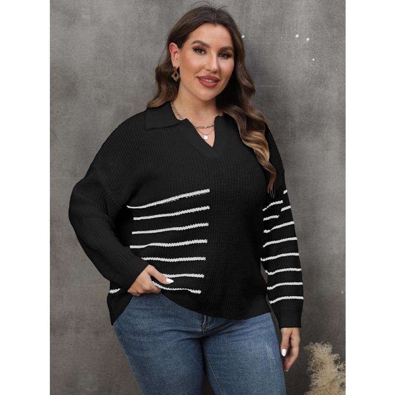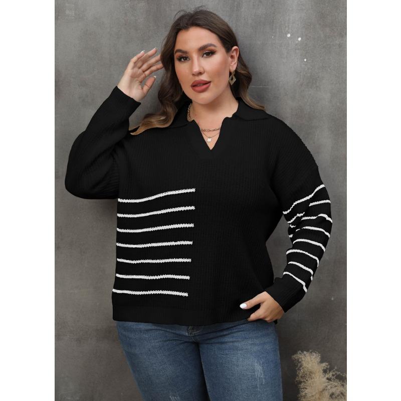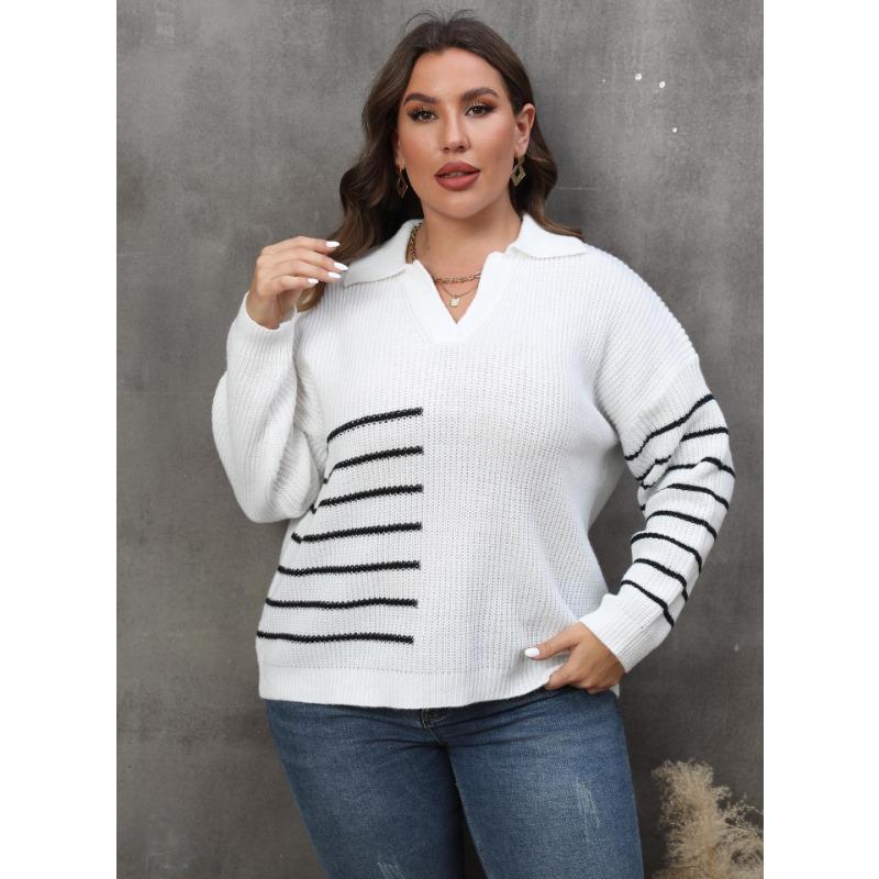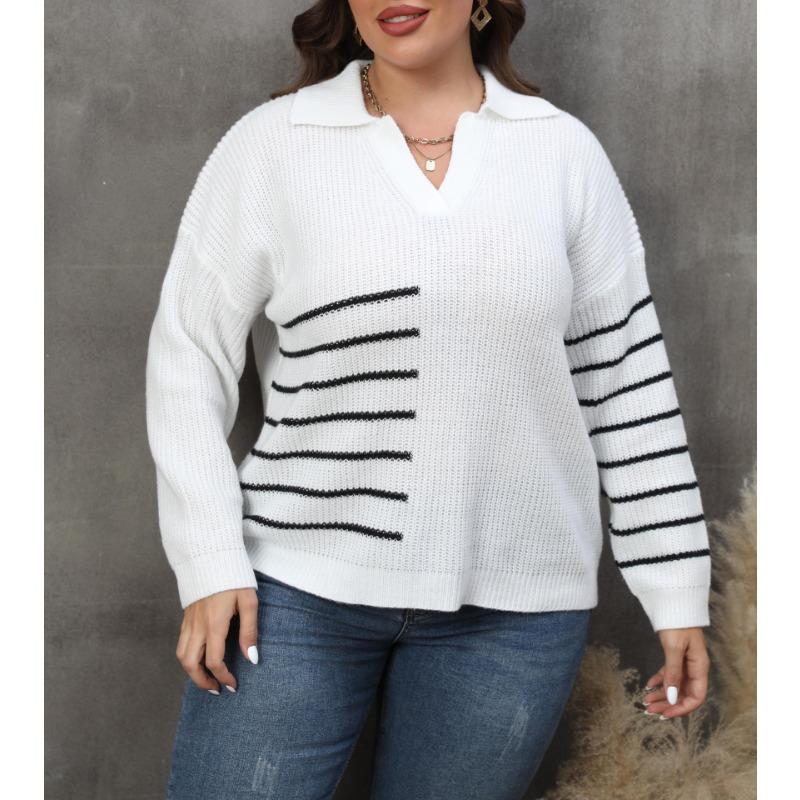 Женский свитер осень-зима больших размеров с полосатым воротником-поло в стиле пэчворк