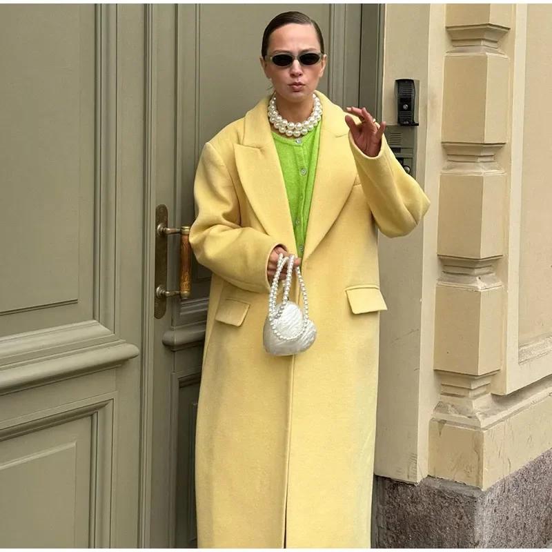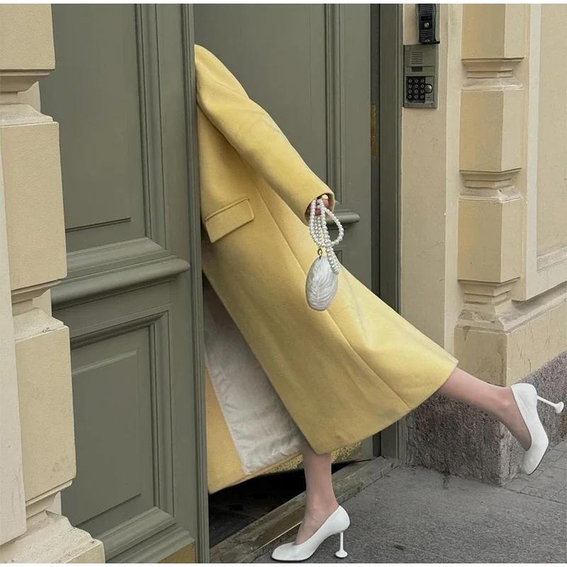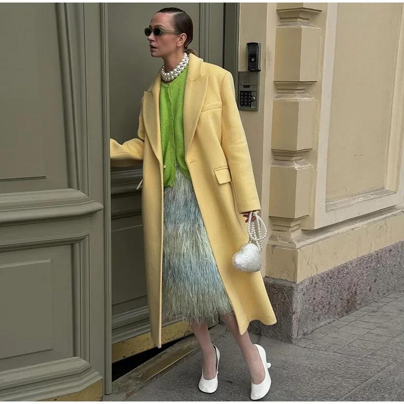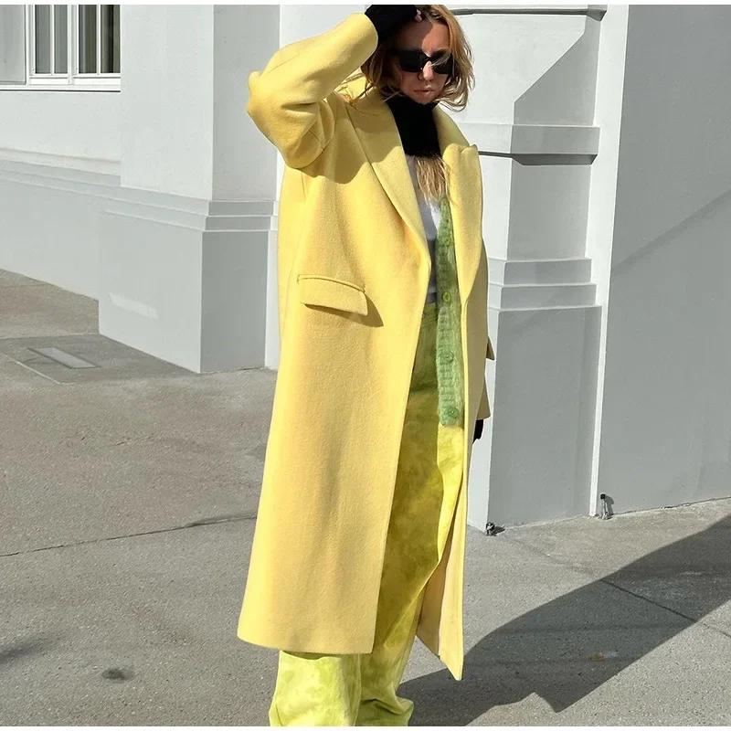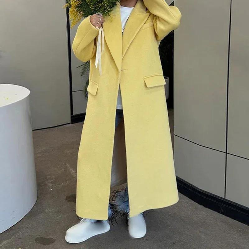 Модное желтое шерстяное длинное пальто для женщин, утолщенное, теплое, свободное, с лацканами, с длинным рукавом, на одной пуговице, однотонное пальто 2024 года, осень-зима, элегантная ветровка