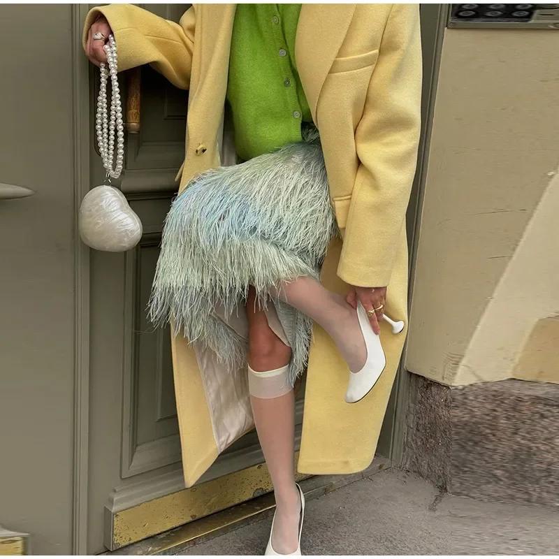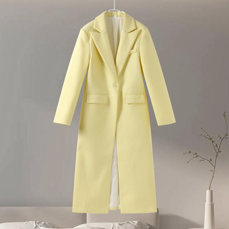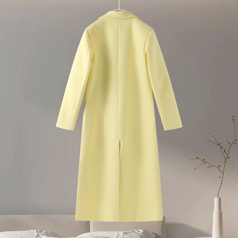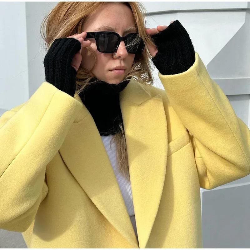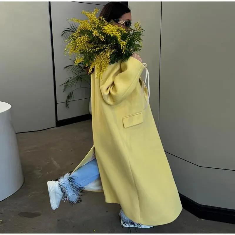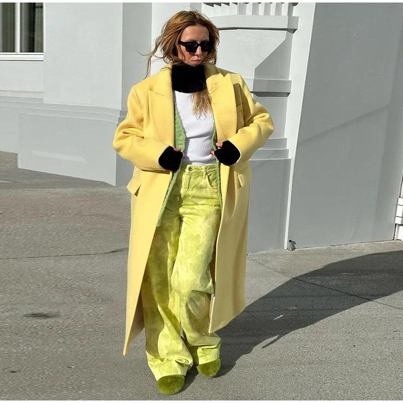 Модное желтое шерстяное длинное пальто для женщин, утолщенное, теплое, свободное, с лацканами, с длинным рукавом, на одной пуговице, однотонное пальто 2024 года, осень-зима, элегантная ветровка