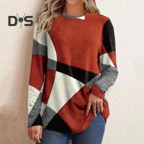 Женские топы с геометрическим узором и лоскутным узором, с круглым вырезом, длинными рукавами, декором из пуговиц, повседневная блузка, свободный крой, туника