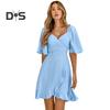 Женское однотонное платье имеет простой вид с рюшами по подолу для элегантного и стильного образа.