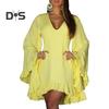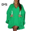 Элегантный и стильный: Женское мини-платье имеет V-образный вырез, расклешенные рукава и неровный дизайн подола, что придает ему простой, но элегантный вид.