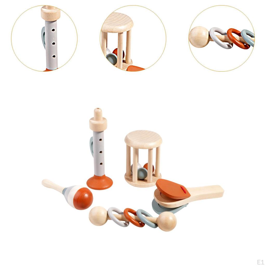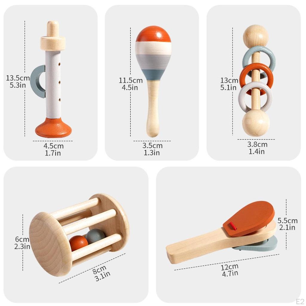- 【Упаковка】: 5 различных инструментов для тряски и ударов: труба, деревянная погремушка-клеточка, погремушка с тремя кольцами, деревянные маракасы, деревянная кастаньета.