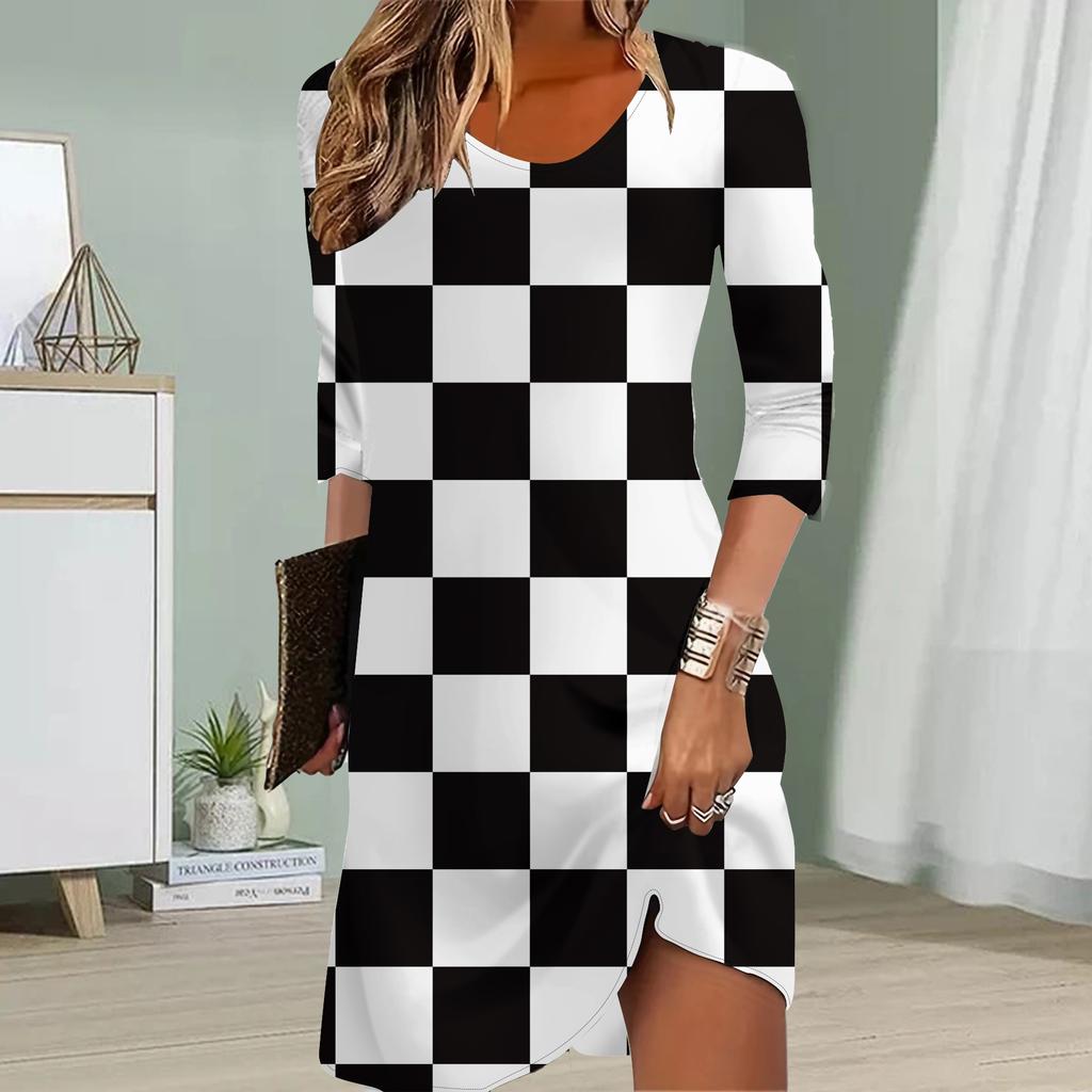 Женское повседневное платье осеннее черно-белое квадратное принтованное платье для женщин с круглым вырезом и коротким рукавом платье больших размеров