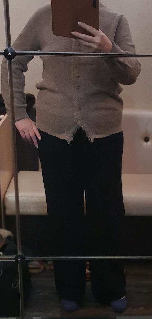 Цвет действительно коричневый вместо серого, но красивый. С размерной таблицей не совпадает по обхвату бедер, вместо обещанных 120 см реальные 96 см. Талия в свободном состоянии 70 см вместо 85 см. Растянуть можно до 110 см. Порадовала только длина брюк 108 см вместо 103 см. Мой рост 165 см, длина подошла. Никаких опознавательных этикеток о составе ткани и размерах нет. Есть непонятный клочок с еще более непонятными цифрами и иероглифами. Ткань тяжелая, плотная, теплая, тактильно приятная. В минус 11 не холодно. Электризуются.