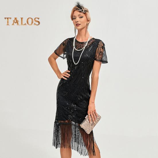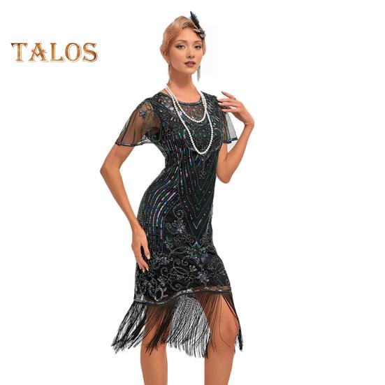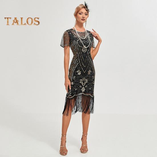 Подчеркните свой стиль с помощью этого женского винтажного платья, изготовленного из высококачественного полиэфирного волокна.. Бахромчатый подол и вышивка пайетками позволят вам без труда подчеркнуть элегантность и очарование, создавая эффектный образ в стиле ретро.