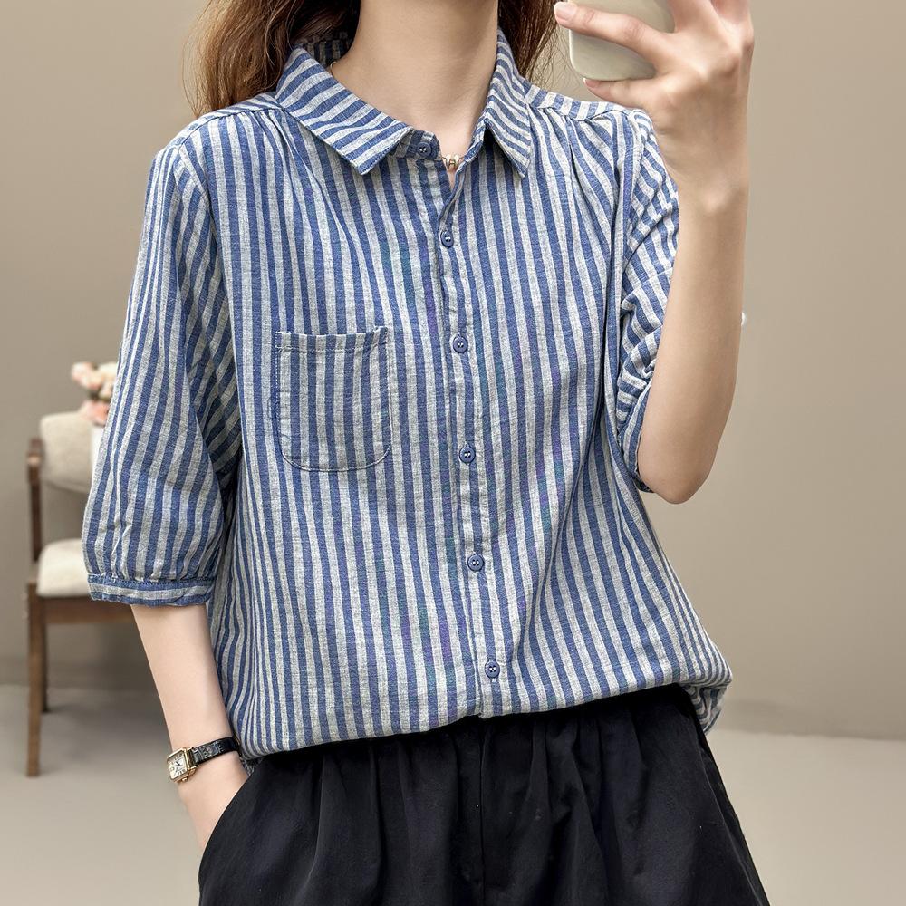 Двухслойная хлопковая пряжа с вертикальными полосками и рукавами 3/4, женская летняя рубашка, новый художественный повседневный универсальный топ с лацканами