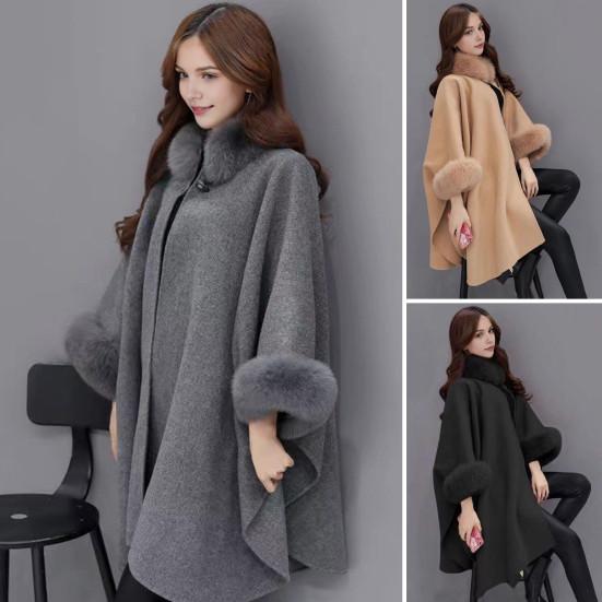 Женское зимнее пальто-накидка с рукавами «летучая мышь» Толстая шаль Свободный воротник-стойка Однотонный декор из искусственного меха Теплая повседневная одежда для работы и отдыха на открытом воздухе Пончо