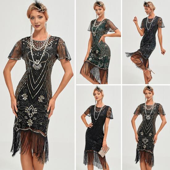 Подчеркните свой стиль с помощью этого женского винтажного платья, изготовленного из высококачественного полиэфирного волокна.. Бахромчатый подол и вышивка пайетками позволят вам без труда подчеркнуть элегантность и очарование, создавая эффектный образ в стиле ретро.
