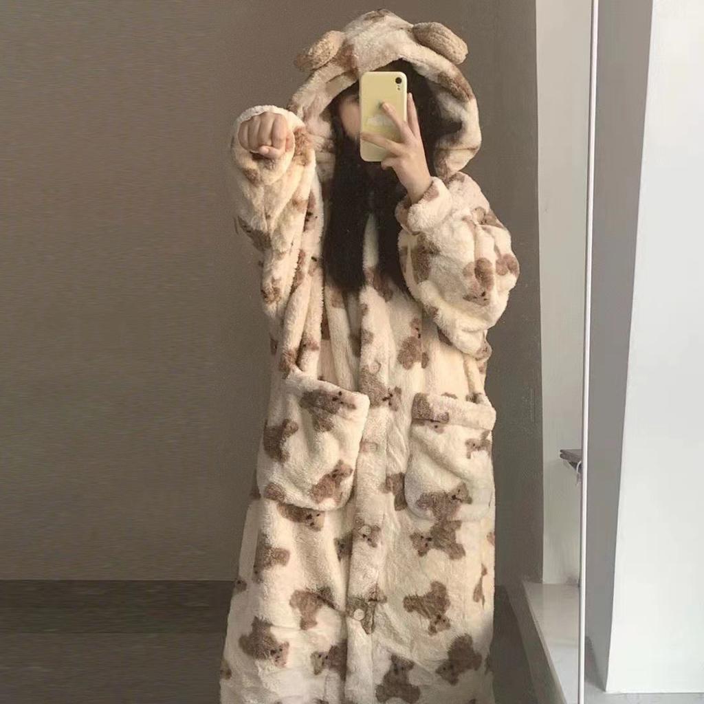 Женская осенне-зимняя теплая фланелевая ночная рубашка, утолщенная пижама с длинными рукавами, коралловый бархат, пуговицы, капюшон, повседневная свободная одежда для сна