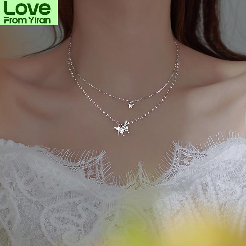 Ожерелье из стерлингового серебра 925 пробы с блестящей бабочкой и кисточкой, женский изысканный двухслойный кулон, цепочка на ключицы, ювелирные изделия для свадебной вечеринки