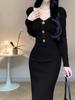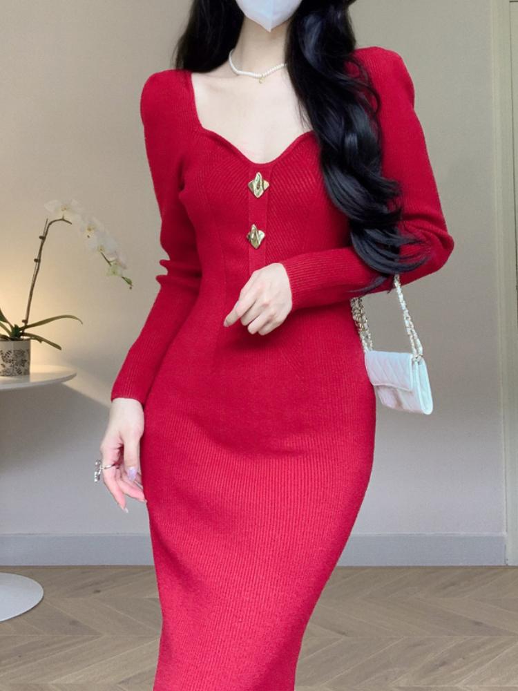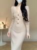 Корейская мода дизайн пуговиц трикотажное платье женское осень квадратный вырез винтажные тонкие вечерние платья эстетическое выпускное платье-свитер Хепберн зима