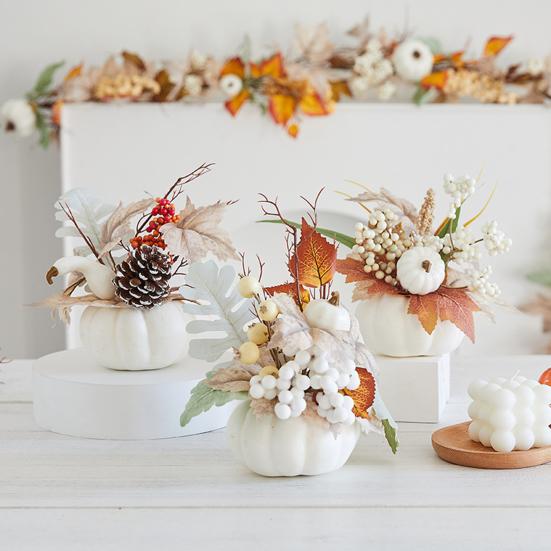 Украсьте свой осенний интерьер с помощью нашего набора для декора интерьера в виде тыквы из пеноматериала. Эти нежные тыквы, украшенные ягодами, кленовыми листьями и шишками, идеально подходят для праздничного ужина и источают осеннее очарование.. Эти искусственные настольные украшения, изготовленные из прочной белой пены, не требуют ухода и выглядят реалистично..