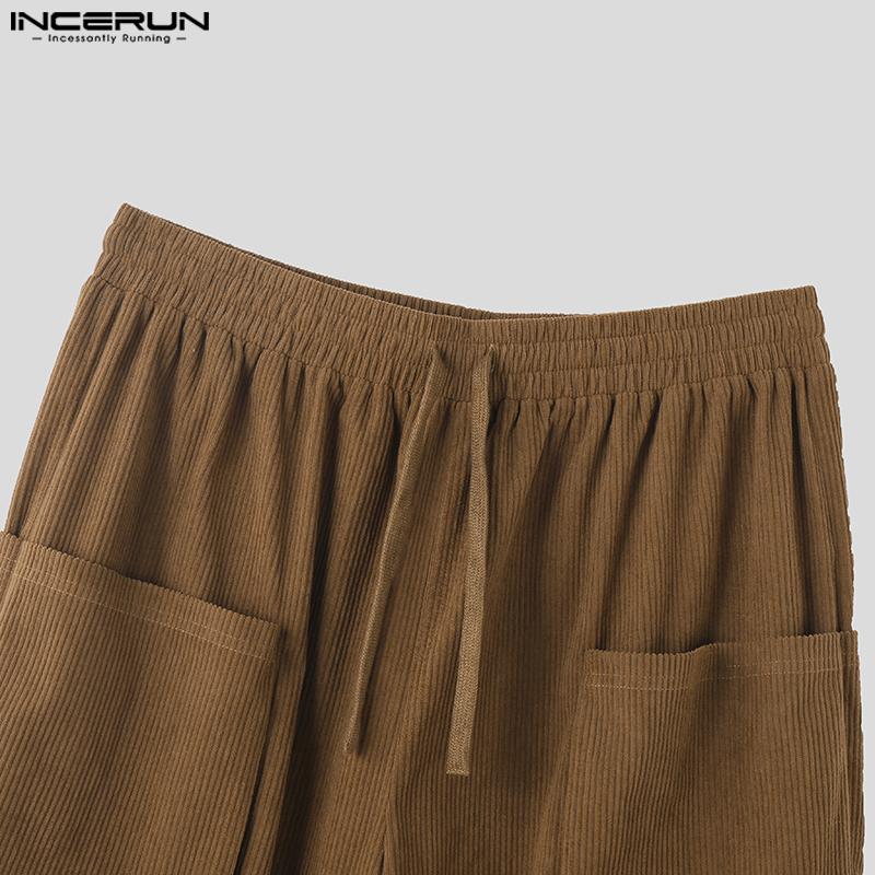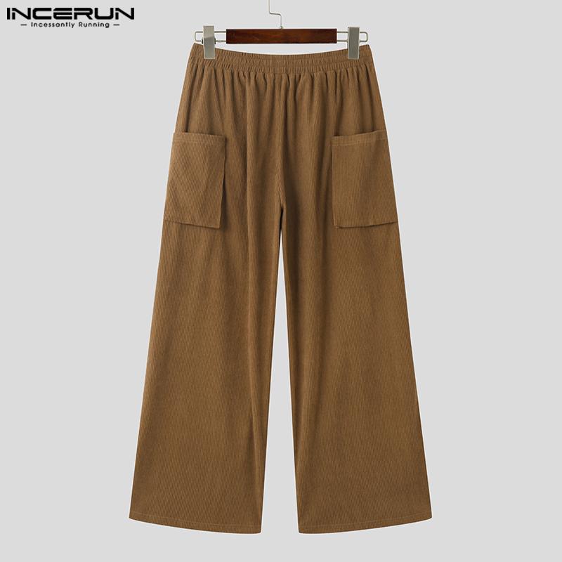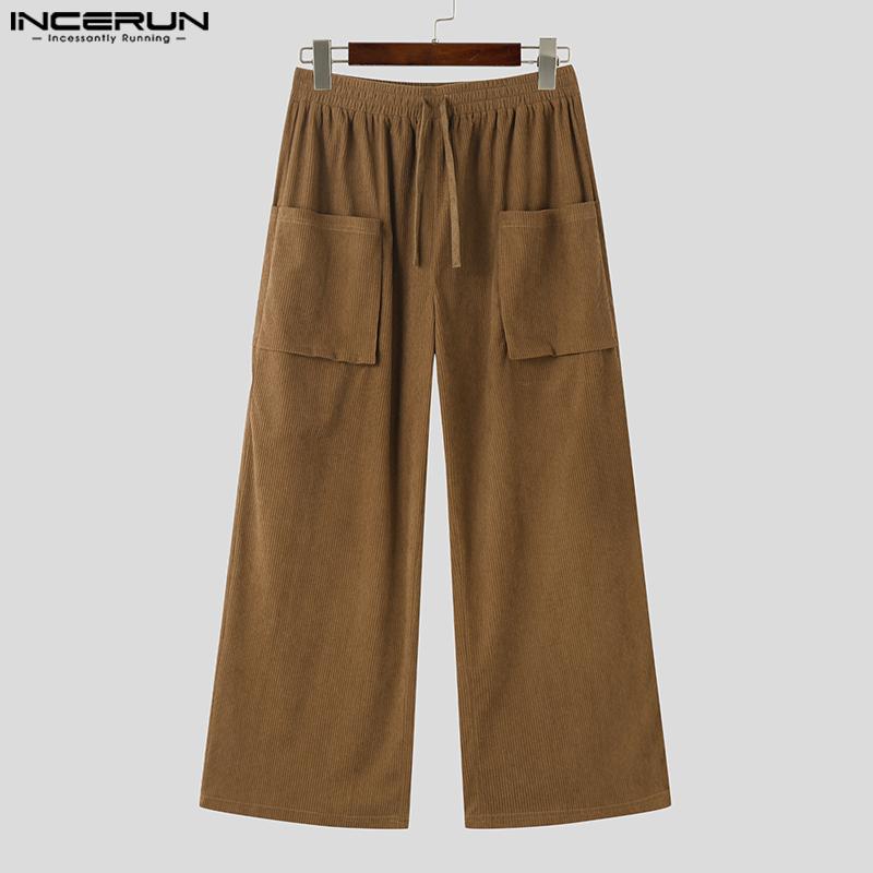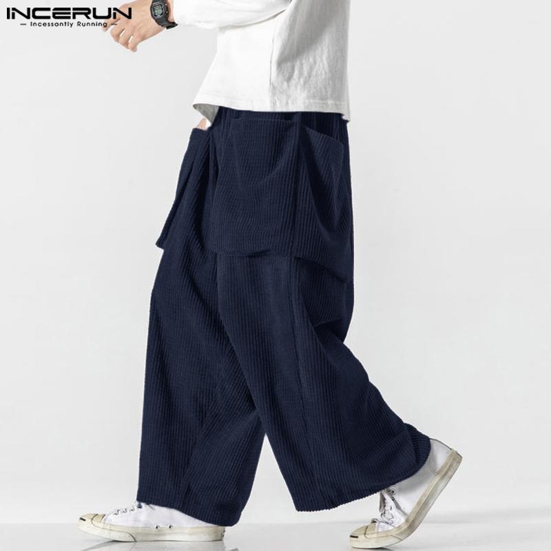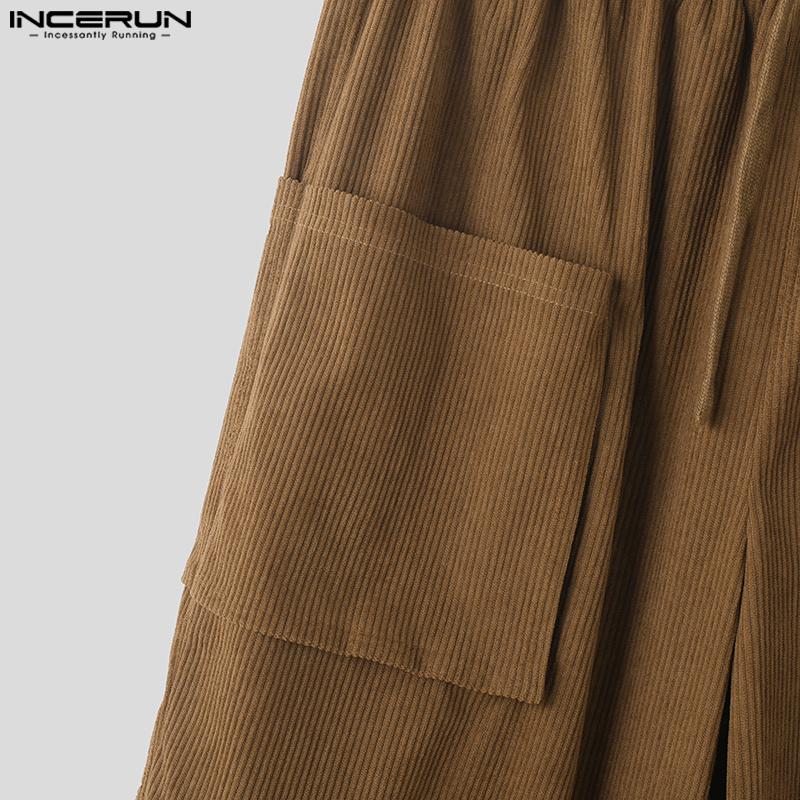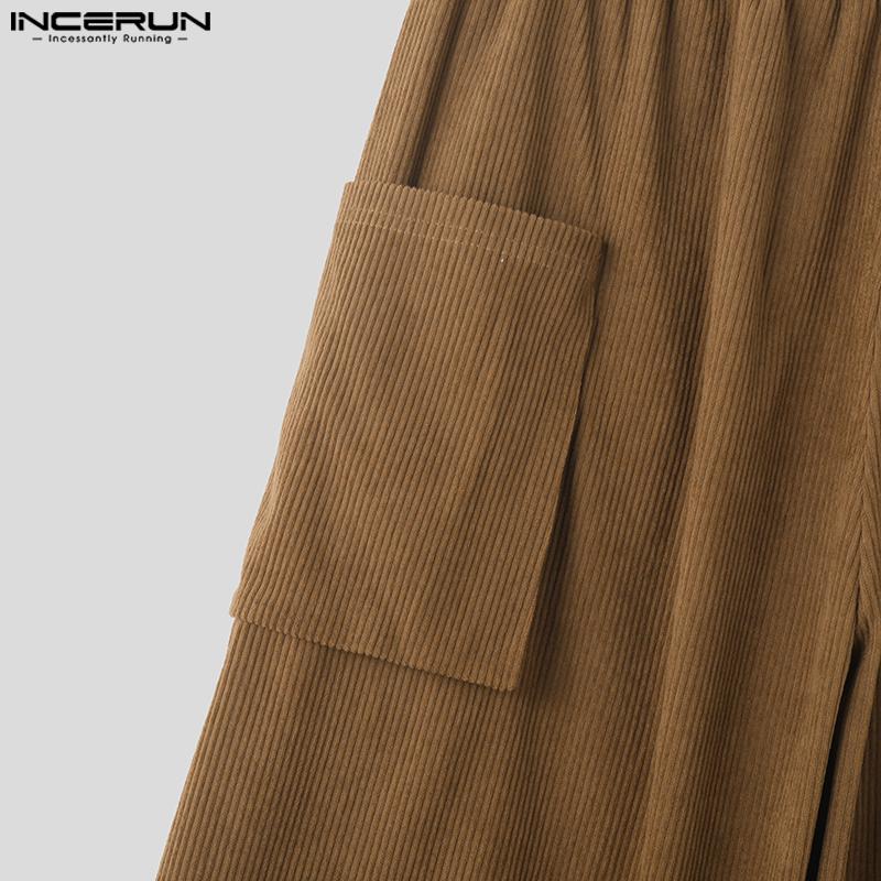 INCERUN Мужские осенние вельветовые брюки с эластичной резинкой на талии, повседневные однотонные прямые широкие брюки