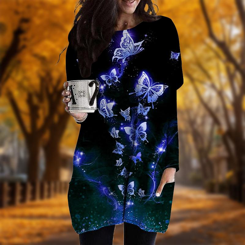 Новинка осени. Платье больших размеров с принтом бабочки. Женское повседневное платье с круглым вырезом и длинными рукавами. Платья с карманами.