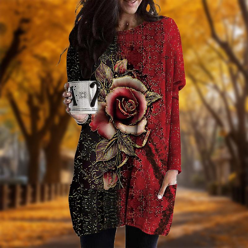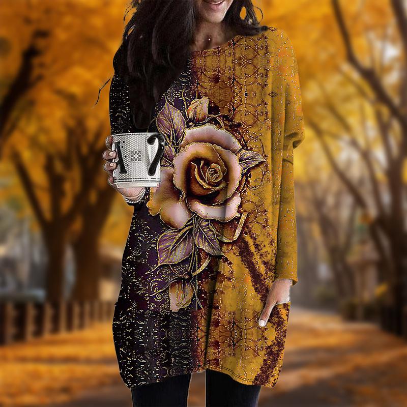 Новинка осени с принтом металлической розы больших размеров женское платье с круглым вырезом и длинными рукавами повседневные платья с карманами