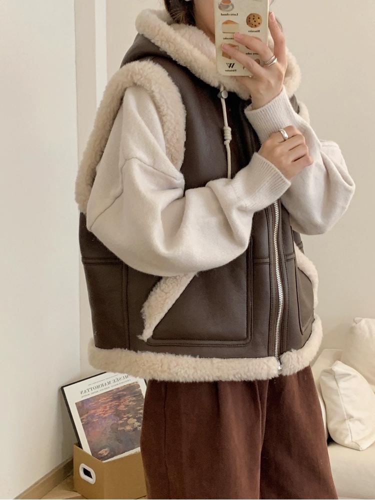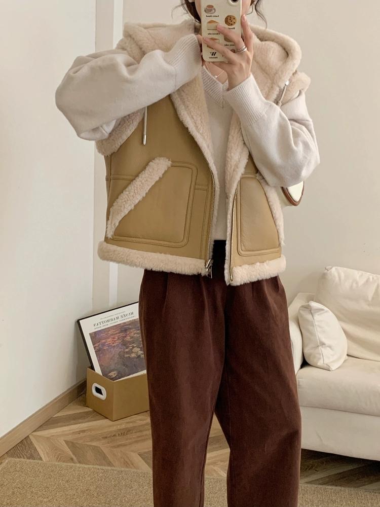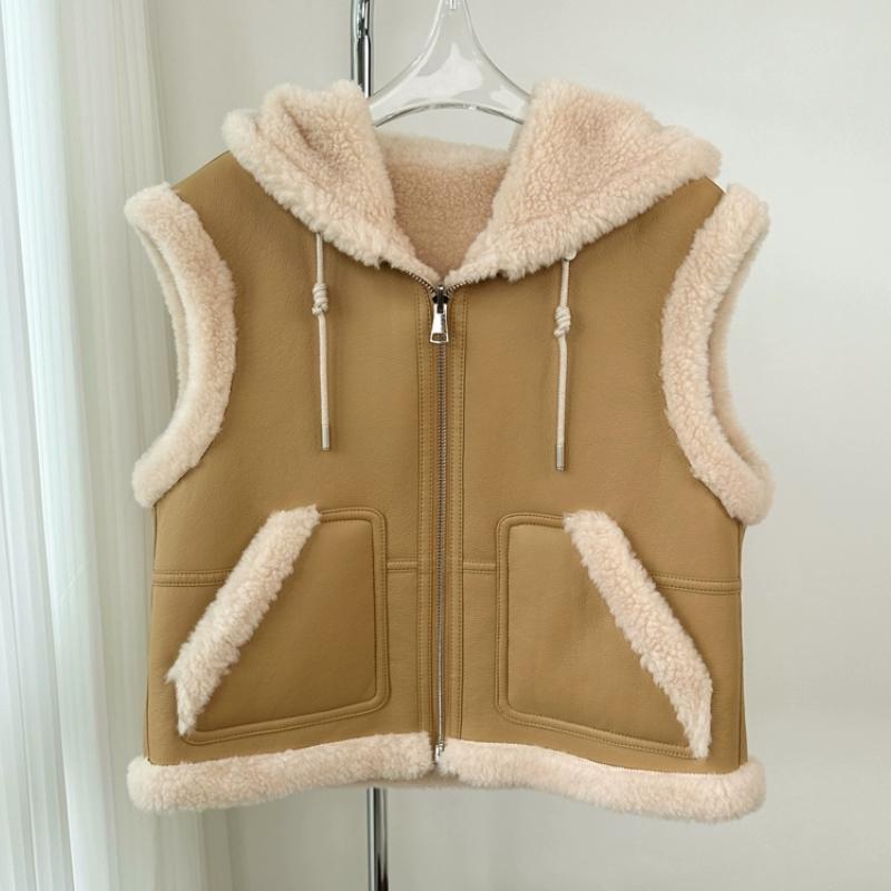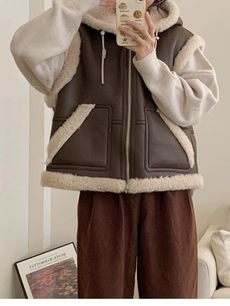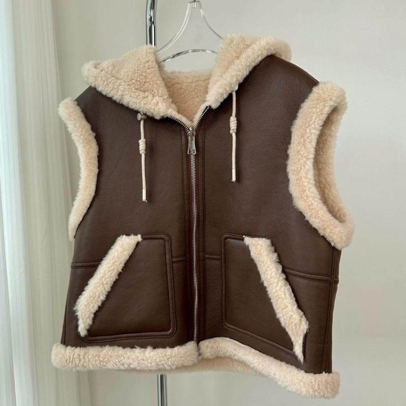 Зимний шикарный винтажный кожаный жилет из овечьей шерсти для женщин, новый дизайн, толстое пальто с капюшоном в стиле ретро, эстетичная повседневная уличная модная куртка