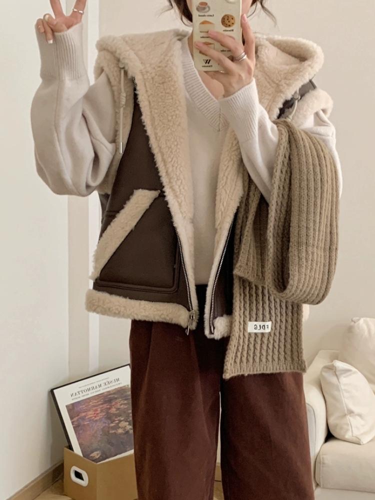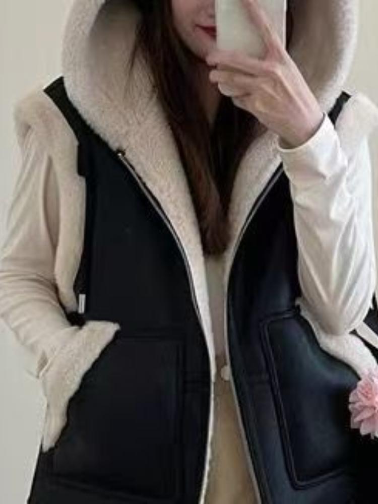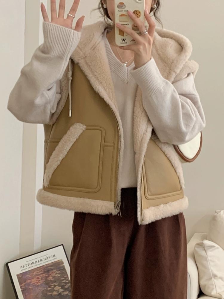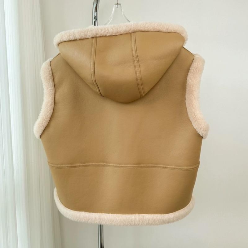 Зимний шикарный винтажный кожаный жилет из овечьей шерсти для женщин, новый дизайн, толстое пальто с капюшоном в стиле ретро, эстетичная повседневная уличная модная куртка