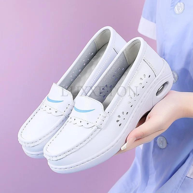 Туфли медсестры из натуральной кожи, женские, с воздушной подушкой, мягкая подошва, удобные, нескользящие, полые, медицинские, рабочие, маленькие белые туфли