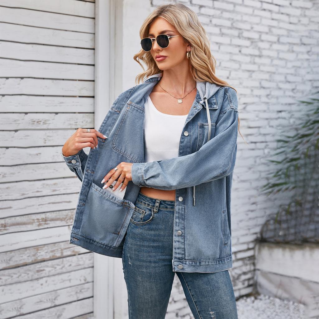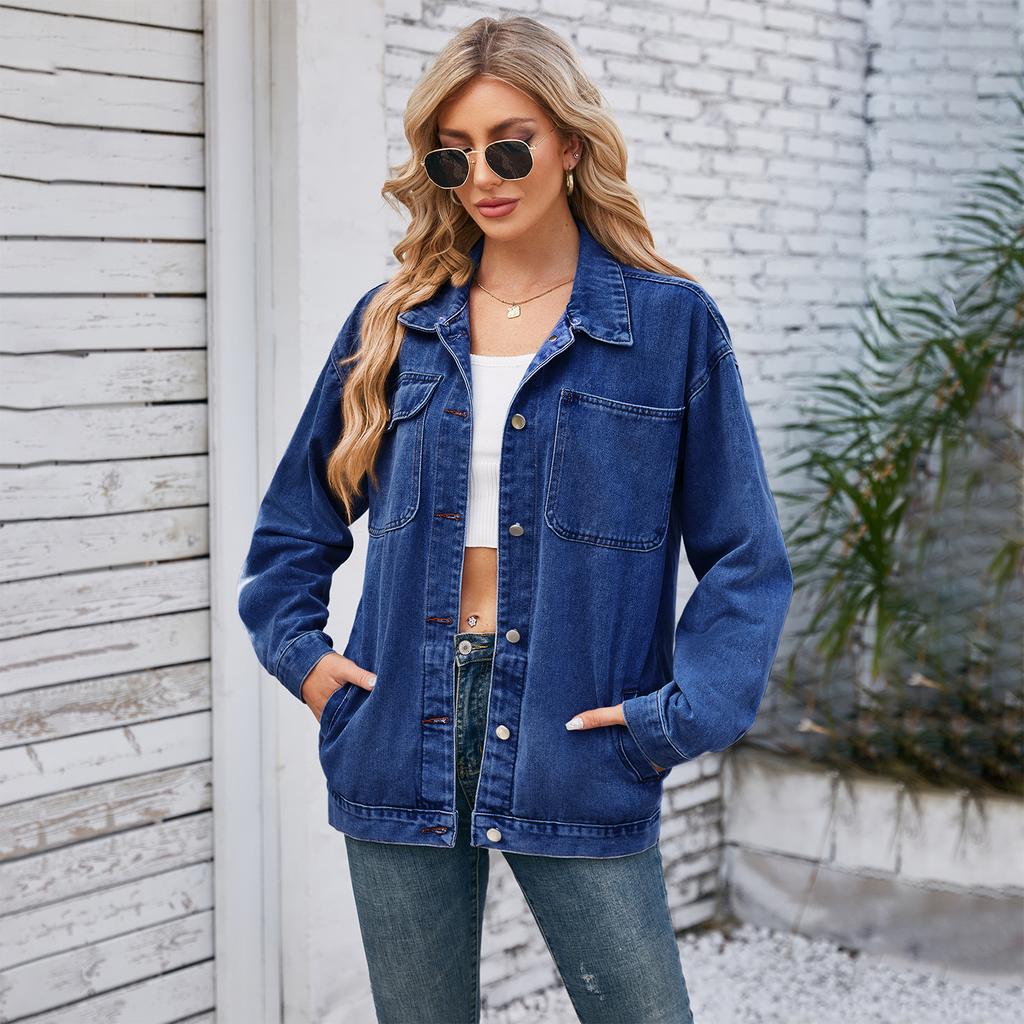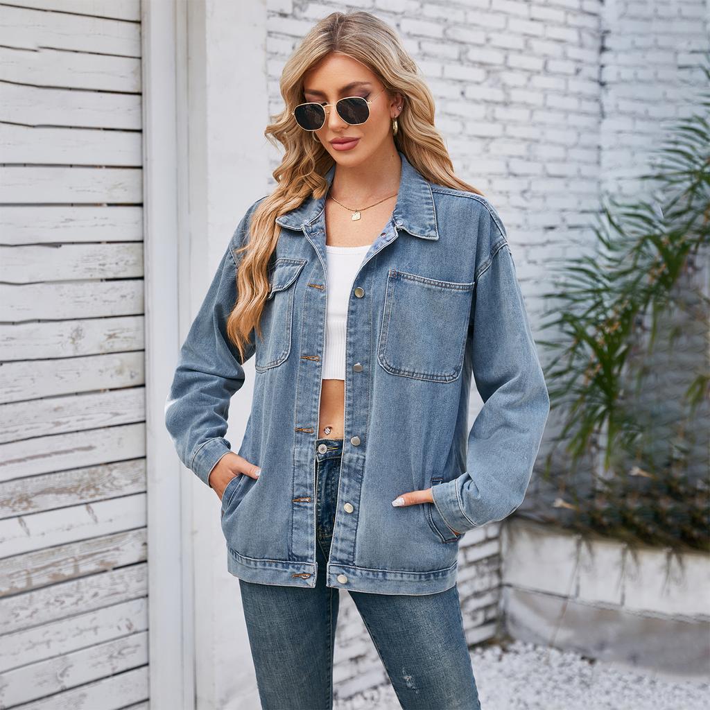 GMXIA Весна Осень Женская винтажная стираная джинсовая куртка Верхняя часть с воротником-поло Длинные рукава Куртки и пальто