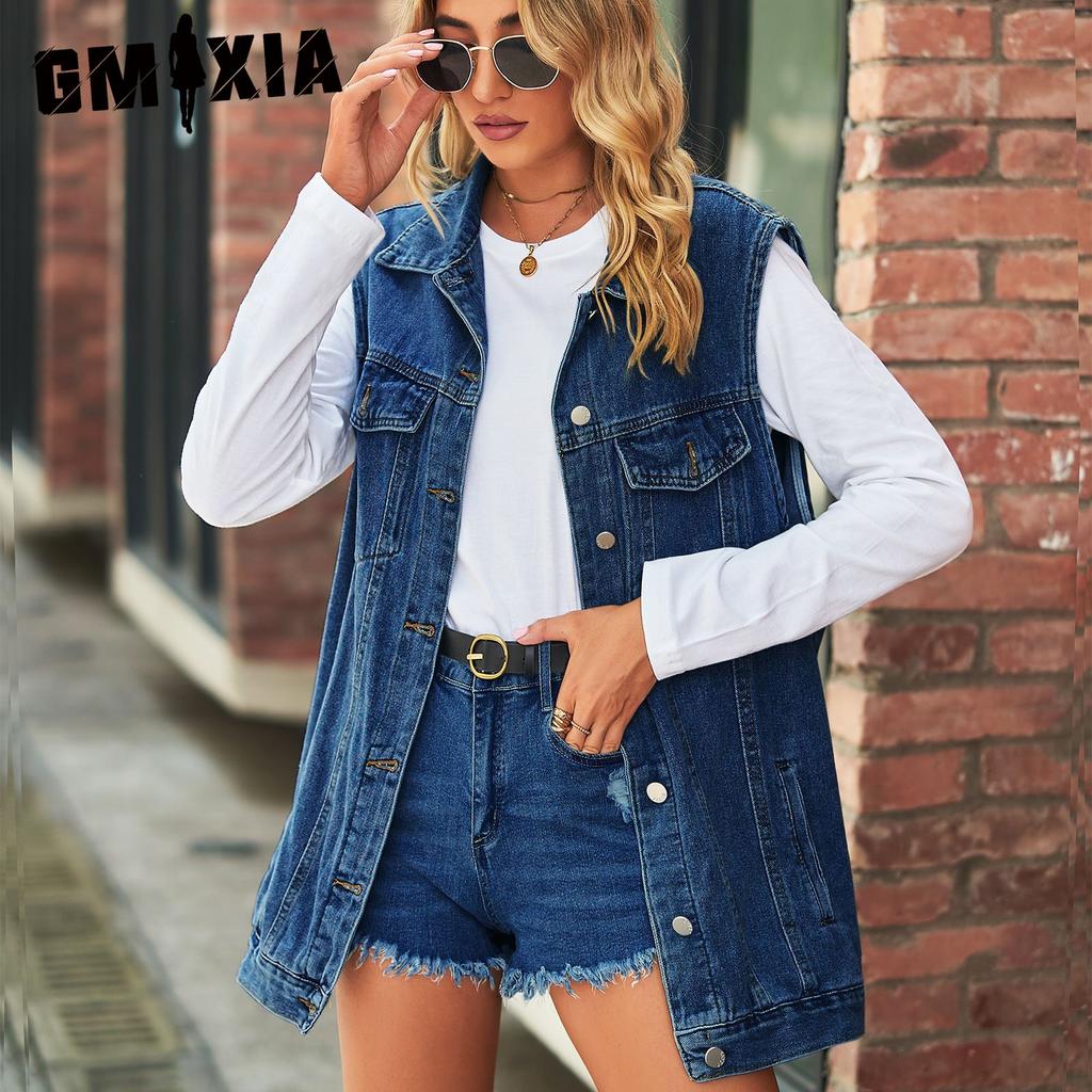 GMXIA Однотонный принт Летний Весенний Без рукавов Воротник ПОЛО Ретро Джинсовый Жилет Свободный Повседневный Женский Тренд — купить товар онлайн с бесплатной доставкой по всему миру!