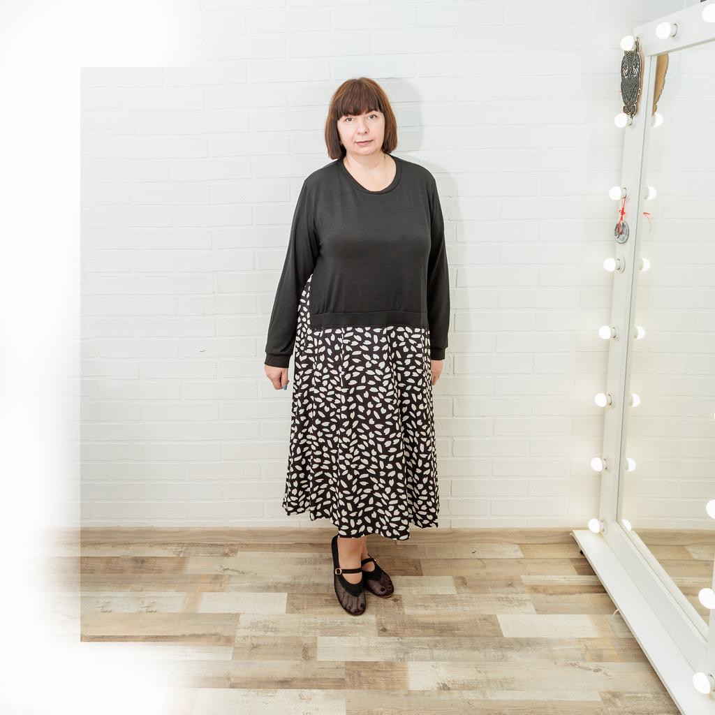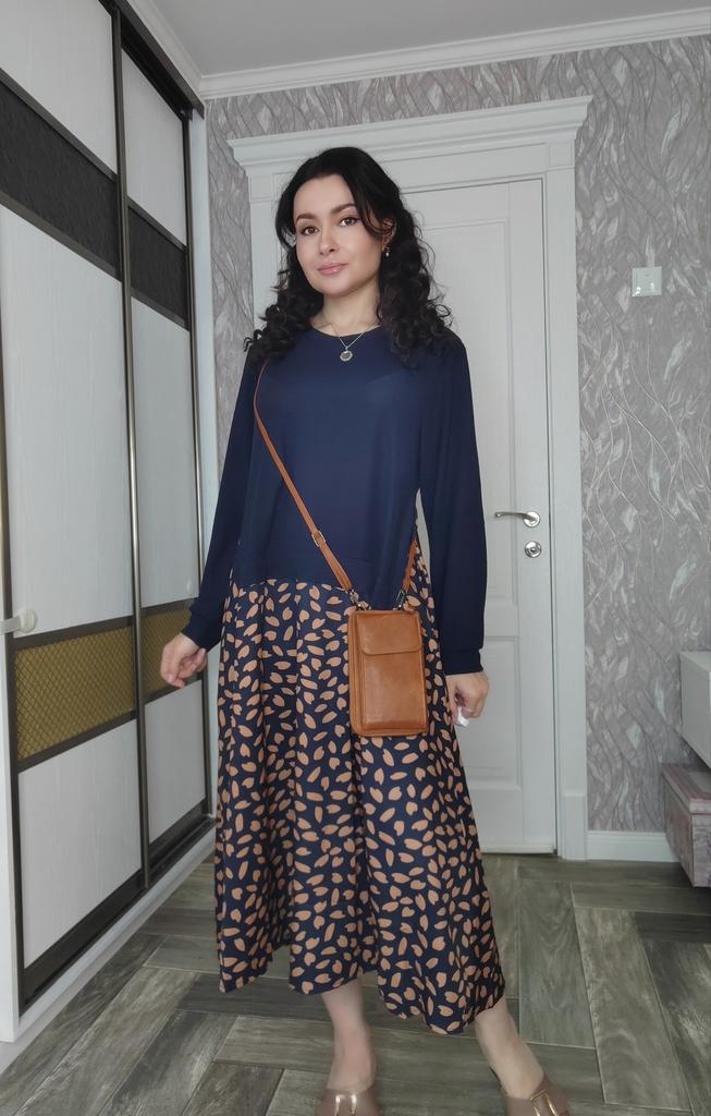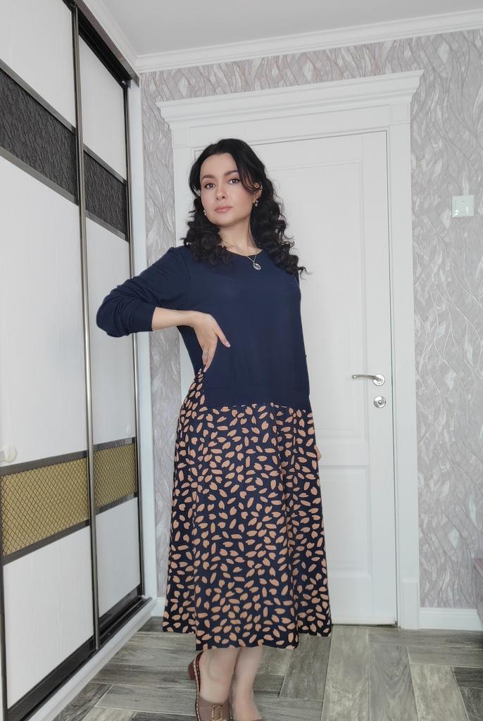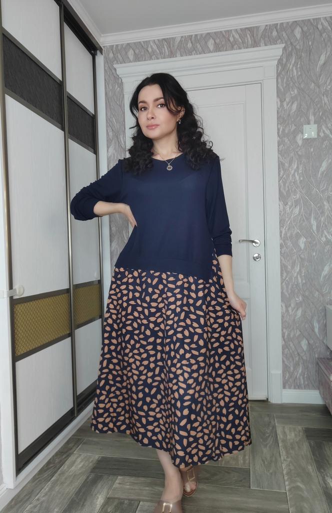 Платье оверсайз оригинального фасона У продавца представлено в различных расцветках. Размерный ряд от XL до 5XL. Платье смотрится так, что будто на юбку надели лонгслив, но обе части сшиты между собой. Горловина имеет O - образный вырез, не тугая. Верх платья: тонкий приятный к телу трикотаж в рубчик, недушный, хорошо тянется. Юбочная часть: лёгкая шелковистая ткань, не просвечивает, электризуется слегка. Нужен антистатик. Состав: 100% полиэстер. Фасон оригинальный, обычно я такое не ношу, но платье понравилось и буду носить. На пышных девочек подойдёт идеально. Присмотритесь, это Ваш вариант. Подойдёт на прохладное лето, позднюю весну и раннюю осень. На мне размер XL. Параметры фигуры 93-60-93, рост 163 см. Сидит свободно. Детальные замеры платья в размере XL: ОГ - 100 см; ОТ - 100 см; Плечи - 43 см; Рукав - 56 см; Длина по спинке - 106 см. Платье имеет фабричный пошив, лишних ниточек не было. Качество хорошее. К покупке рекомендую!