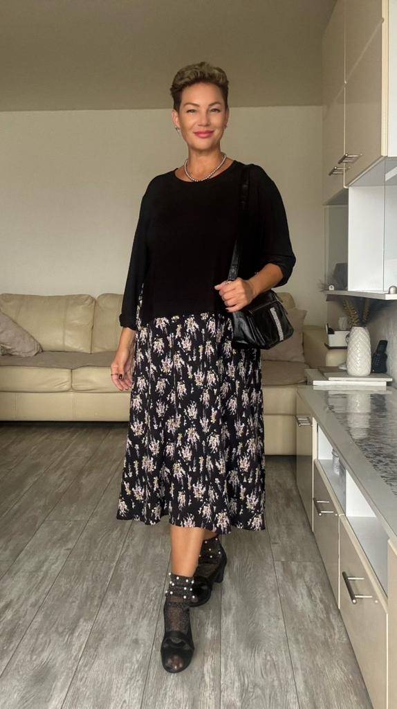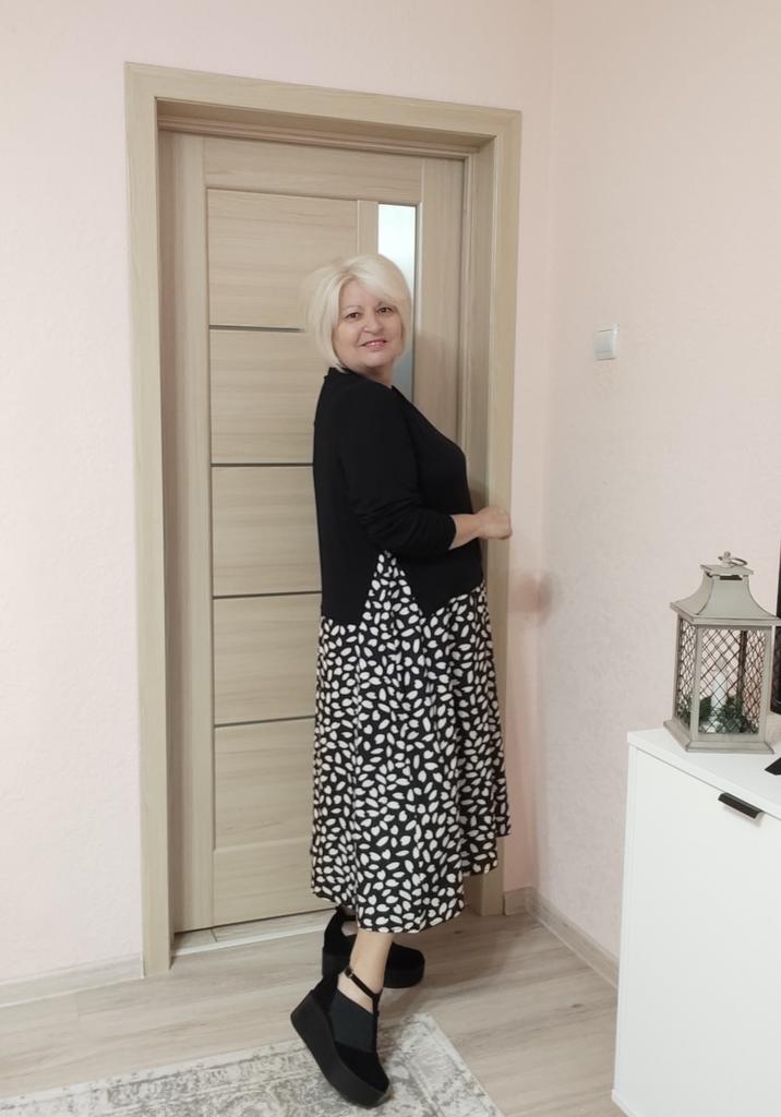 Платье с красивым дизайном 😍 ✔️Отличное комбинированное платье из двух материалов верхняя часть строгий черный трикотаж и лёгкий шелковистый чёрно-белый низ. ✔️Это платье которое подойдёт на все случаи 🤩как говорится и в пир и в мир. ✔️ Платье мне понравилось, лёгкое, приятное тактильно и очень удобное. ✔️ Платье с круглым вырезом горловины, рукава длинные подойдут и для высоких девчонок . ✔️Платье с пышным богатым низом смотрится красиво и скрывает все недостатки фигуры. ✔️ Материал полиэстер приятный к телу. ✔️ У продавца в наличии четыре цвета на выбор. ✔️ Размерный ряд с XL до 5XL на мне 3 XL можно было спокойно заказывать на размер меньше. ✔️ Размер соответствует описанию продавца. ✈️Посылка шла около десяти дней в Молдову-Кишинёв ✔️Посылка была упаковано отлично. ✔️Нитки не торчат. ✔️Нет неприятного запаха. ✔️Дизайн интересный. ✔️Качество хорошее. ✔️Размер подошёл свободно. 📌Я ростом 1,65 сm Мои параметры: ОГ - 110 см ОТ - 100 см ОБ - 118 см 💯Рекомендую товар и продавца! Заказывайте не пожалеете!!!
