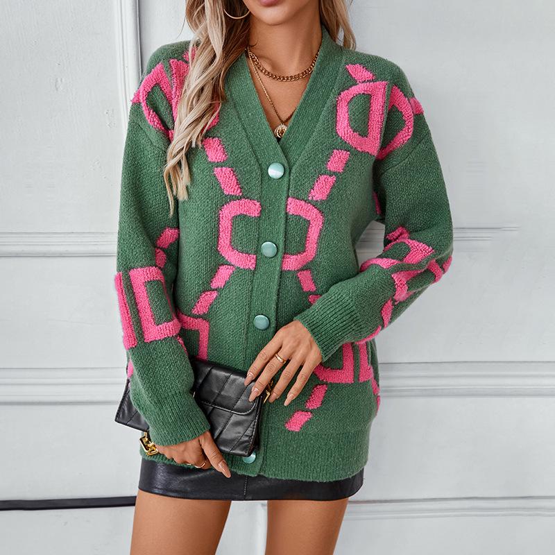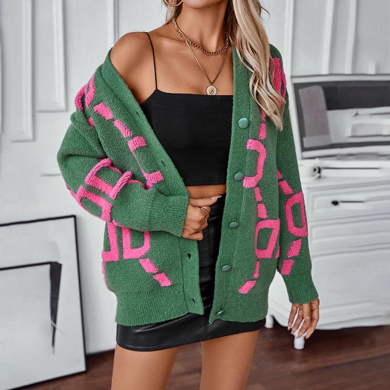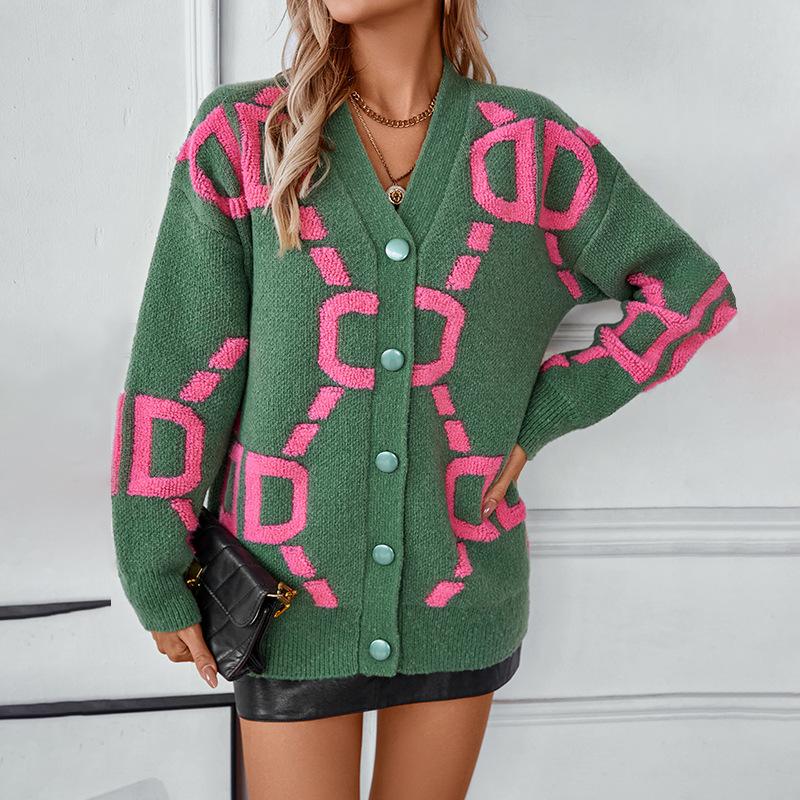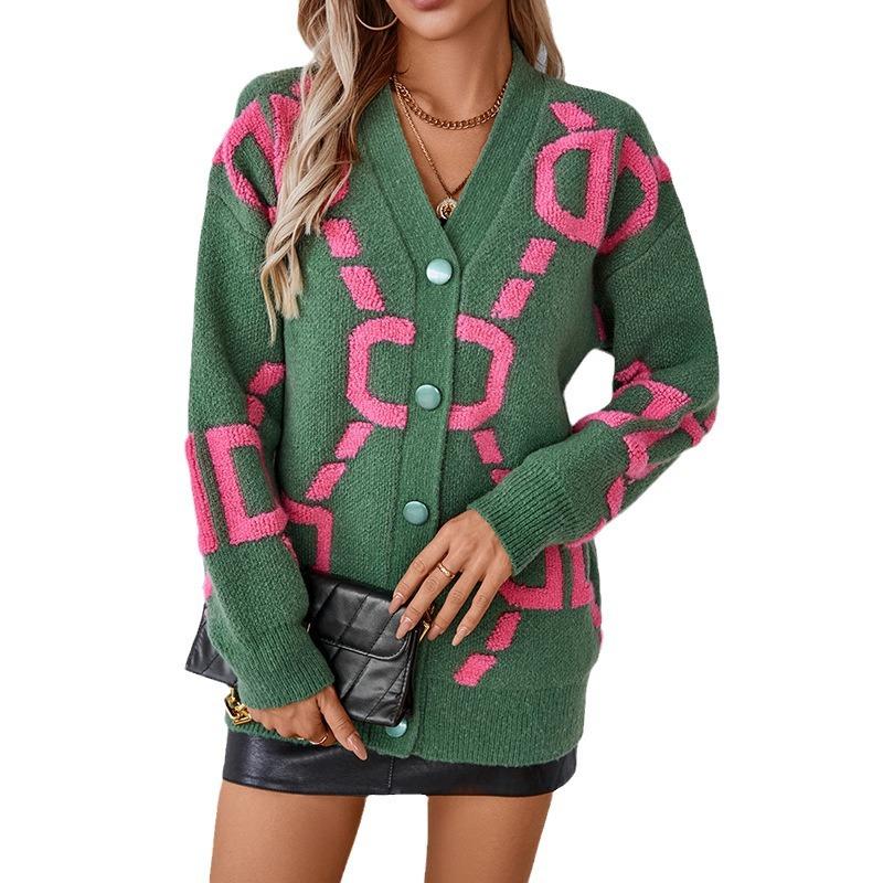 2024 Европейский и Американский Осень-Зима Новый Вязаный Кардиган Женский Вышитый Однобортный V-образный вырез Свободный Цветной Блокированный Свитер