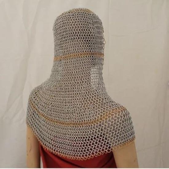 Погрузитесь в мир средневековой истории и реконструкции с этим средневековым алюминиевым кольчужным капюшоном.. Тщательно изготовленный из высококачественного алюминия 16-го калибра, этот капюшон представляет собой легкое, но прочное решение для боевых костюмов, исторических реконструкций или мероприятий по косплею.. Капюшон имеет эффектную золотистую отделку, что делает его выдающимся аксессуаром, воплощающим элегантность и практичность.. Края усилены кольцами для дополнительной прочности и придания аутентичного средневекового вида.